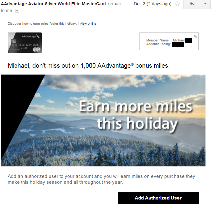 Via Reddit, some people are getting targeted offers for the Barclays Aviator Red offering 1000 AAdvantage miles for adding an authorized user by December 31, 2015. There seems to be no spending requirement attached to this offer.