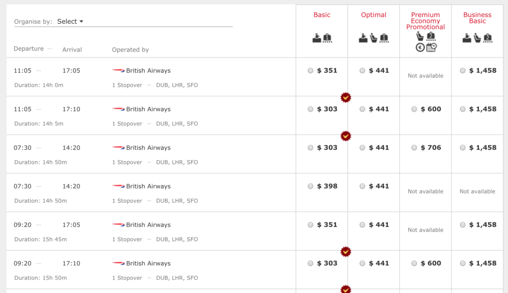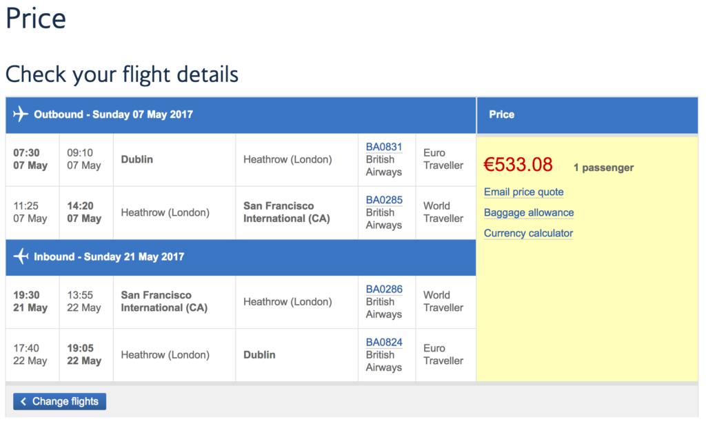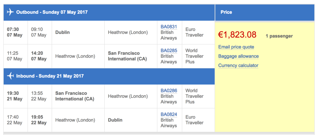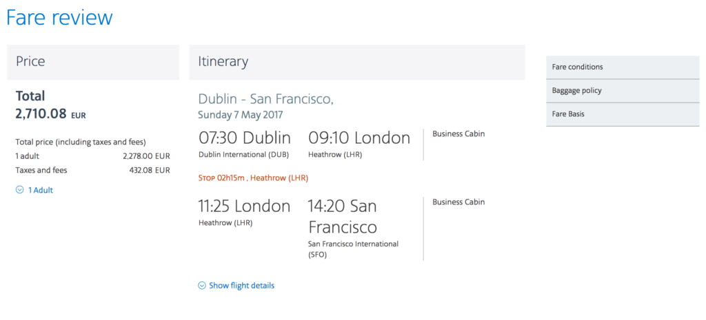 As I mentioned in my post about Dublin bookings, I don’t particularly mind flying in economy class in the westbound direction (Europe -> US), because the flight is typically during the daytime and the westbound jet lag doesn’t affect me all that much. It is much more important that, if I were to fly business class at all, it be on my outbound (redeye).