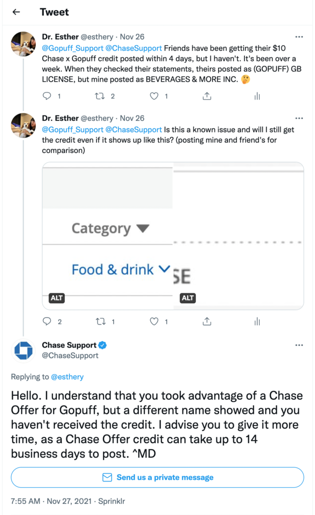 I reported the issue to Chase and Gopuff. Gopuff Support said they’d send it to engineers. It’s been nearly 3 weeks and nothing has changed, so I’m not sure what the engineers are going to do about it. Chase also responded on Twitter and said that it could take 14 business days to post. Well, it hasn’t been 14 business days yet (almost!), but given that I have over 5 orders with Bevmo as the merchant name that haven’t gotten the credit, and 3 orders with Gopuff as the merchant name that got the credit within 1-2 days, I have a feeling it will never post. Yes, I did just pay over $50 of real money to Gopuff to learn this so I could save you all the hassle. 🙂