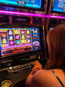 They have free slot play tournaments Sunday – Thursday at 11:00am, 11:30am, 8:00pm, and 8:30pm. Friday – Saturday 11:00am and 11:30am. The tournament contains a maximum of 20 people. You hit a button as fast as you can for five minutes and the one with the most points at the end wins. (from Esther: the game is completely based on pure luck, but in the 11:00 am tournament on Thursday that we played in, two of my friends earned 2nd and 3rd place!)