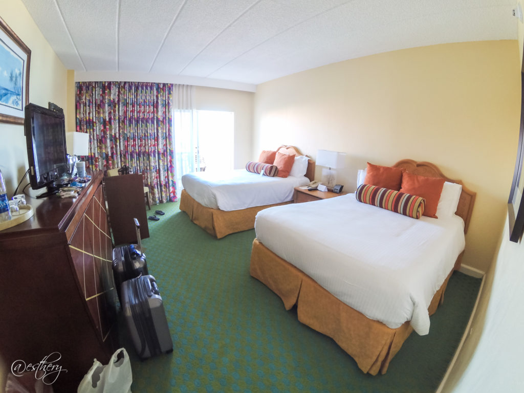 Upon check-in, we were given the crappiest rooms in the Beach Towers by a receptionist who I wouldn’t exactly describe as friendly. When we got up to our room, the view was of a large flat roof.