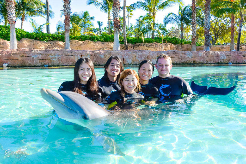 Make your reservations first thing after checking in (call the Dolphin Cay from your room during their open hours and make a reservation). Wetsuits are provided. No cameras allowed whatsoever. No jewelry allowed. The experience is approximately 1 hour and consists of a short orientation (i.e. never touch the dolphin’s face, they don’t like it), and then you split up into ~5 groups. Each group has a trainer and a dolphin, and the trainer will have the dolphin do a few tricks, and then each person gets photos with the dolphin — kissing, high-fiving, and feeding, and then a pose behind the dolphin. Basically, there is a LOT of waiting around while each person takes photos. Warning: the official photographers are not very good and many of our photos came out focused on the wrong thing. Also, the photos are expensive. We purchased our group photo for $30 (an 8×10). The digital photos cost $149, even if you only want ONE photo, it doesn’t matter. It’s really a shame you can’t bring a GoPro or something. Since this free interaction is only for one person per room, your companions can watch from a viewing deck that is pretty far away (basically, they can’t really see much and they can’t talk to you). There is an option to watch from the little beach but it would cost them $33 for that privilege. |
