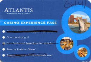 The Casino is not part of the Total Rewards or Caesars network, as I erroneously believed in the beginning. So, your Diamond card is useless here, no special lines for you or anything. You can get a specific Atlantis player’s card, or your room key also works as a player’s card.