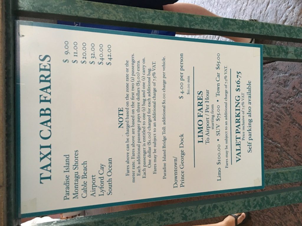 Sadly, the Bahamas does not have Uber, so we arrived at NAS and found a sea of taxis. They stated that the fare was $32 for the first 2 people, $3 per person thereafter, $2 for the bridge toll to Paradise Island (entering the island only), and $1 per piece of luggage.We told them we had 5 people and they piled us into a van and said it would be $32+$3×9+$2+$1+$1+$1=$49 (we had 3 pieces of carryon luggage). I later found out that the sign on the taxi stand says each person is entitled to 1 bag and 1 carryon, and the $1 is only for additional bags, so we were overcharged $3. Oh well. Here is the price list for your future reference: