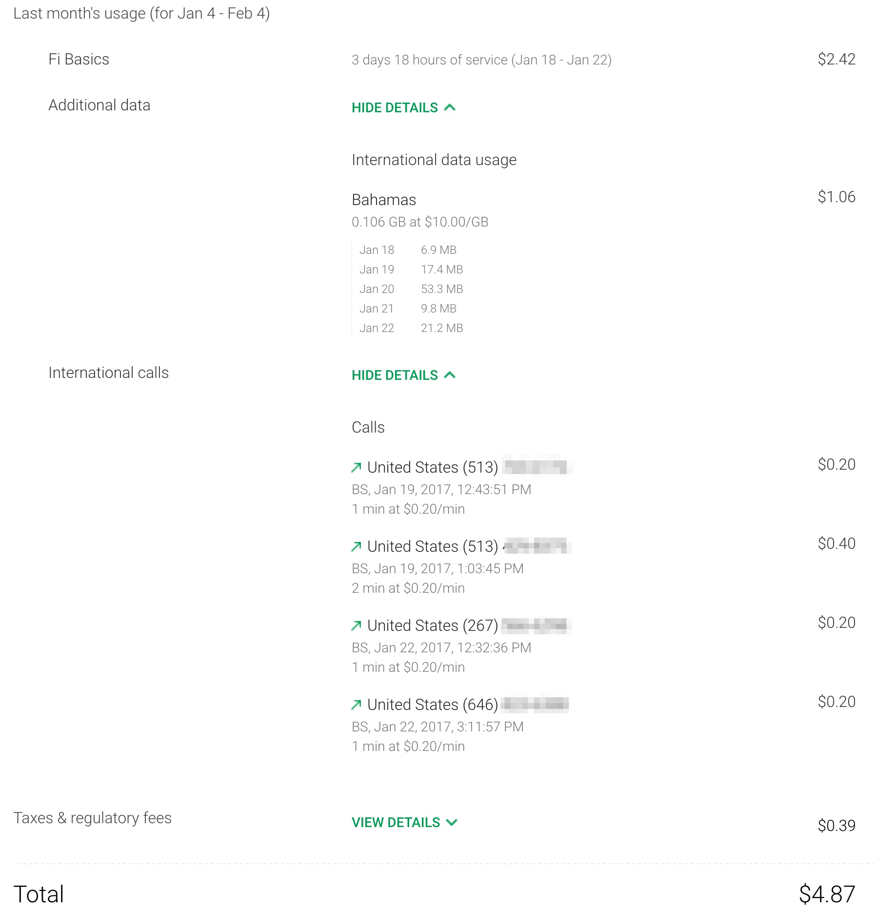However, I don’t really travel internationally THAT often, so I wanted something I could easily turn on and off, and that’s why I jumped on that Nexus 6P Slickdeal. Here is the list of Google Fi’s supported countries. Google Fi charges $20/month for the base service, then $10 per GB of unthrottled data on top of that. It’s important to note that these charges are PRORATED down to the hour of service and tenth of a MB of data used, so you only pay for exactly what you used. As an example, my husband used Google Fi for our trip to the Bahamas, and despite frequently reading on his phone (and even using remote desktop a few times), our total bill for January was $4.87, which even included a few short phone calls (charged at $0.20/min). Here’s the breakdown: