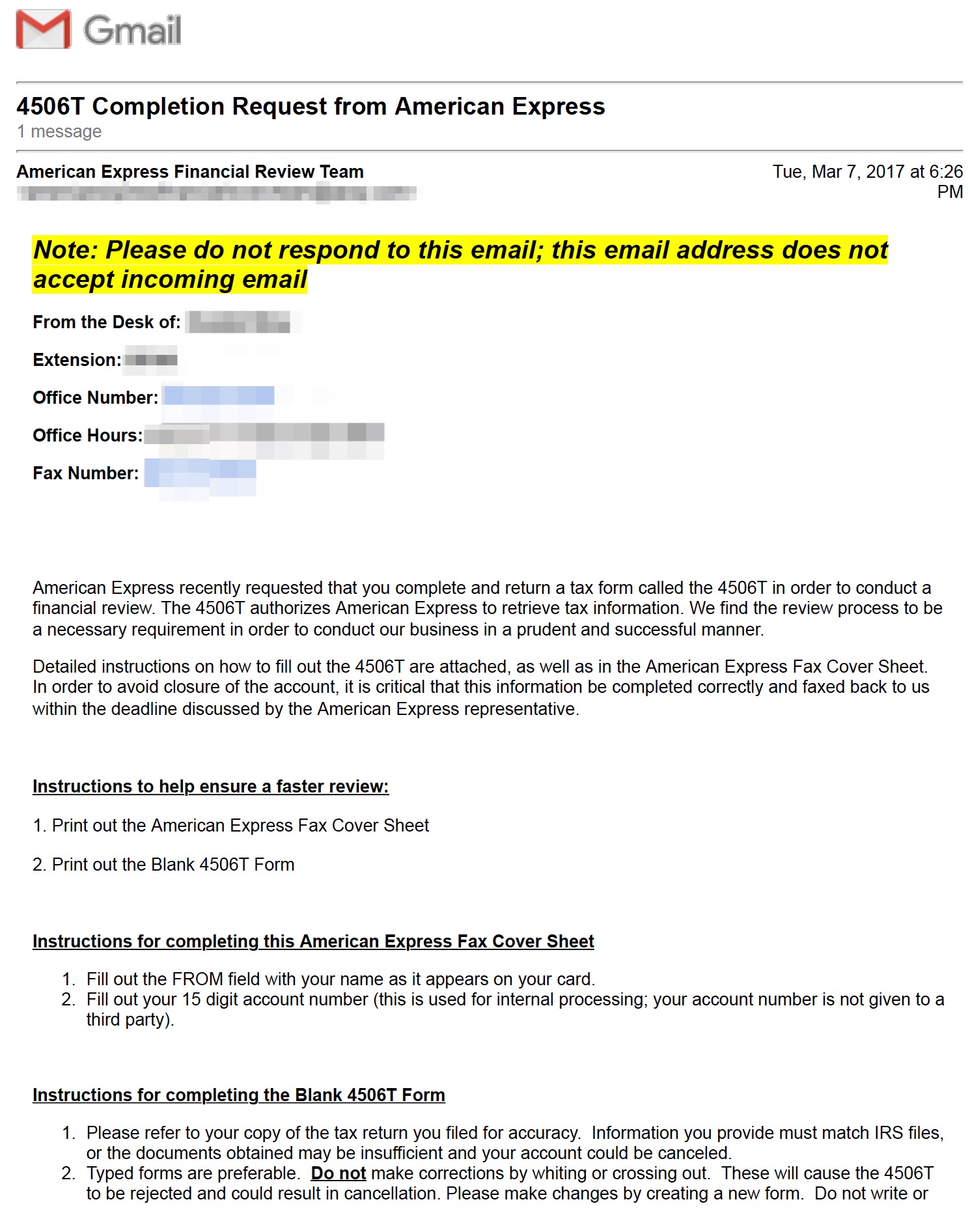 My representative said she’d email me the Form 4506T, and to please complete it within 2 weeks or else all my Amex accounts would be permanently closed. I received the email: