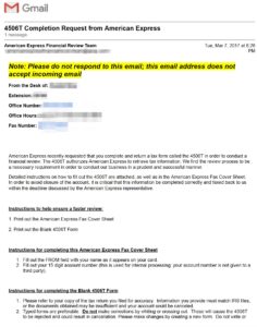 My representative said she’d email me the Form 4506T, and to please complete it within 2 weeks or else all my Amex accounts would be permanently closed. I received the email: