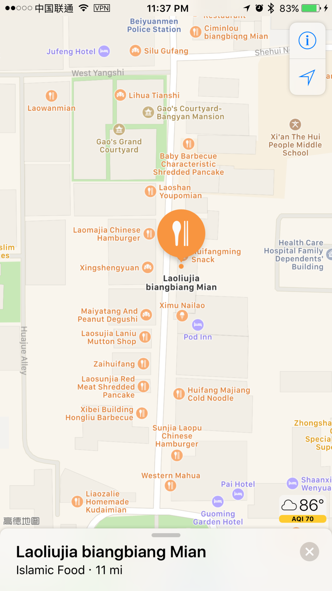Hearing my complaints, my friend Micah suggested trying Apple Maps. I haven’t opened that app in months. I opened it up and was immediately impressed. First of all, I discovered a well-rated liang pi (cold noodle) restaurant just downstairs from where I was staying. It was not on Google Maps, and it wasn’t even on Swarm or Foursquare (generally my favorite app for local recommendations worldwide). I went for breakfast and it was awesome! I have Apple Maps to thank for that. On Muslim Street, it shows all the local restaurants correctly too: