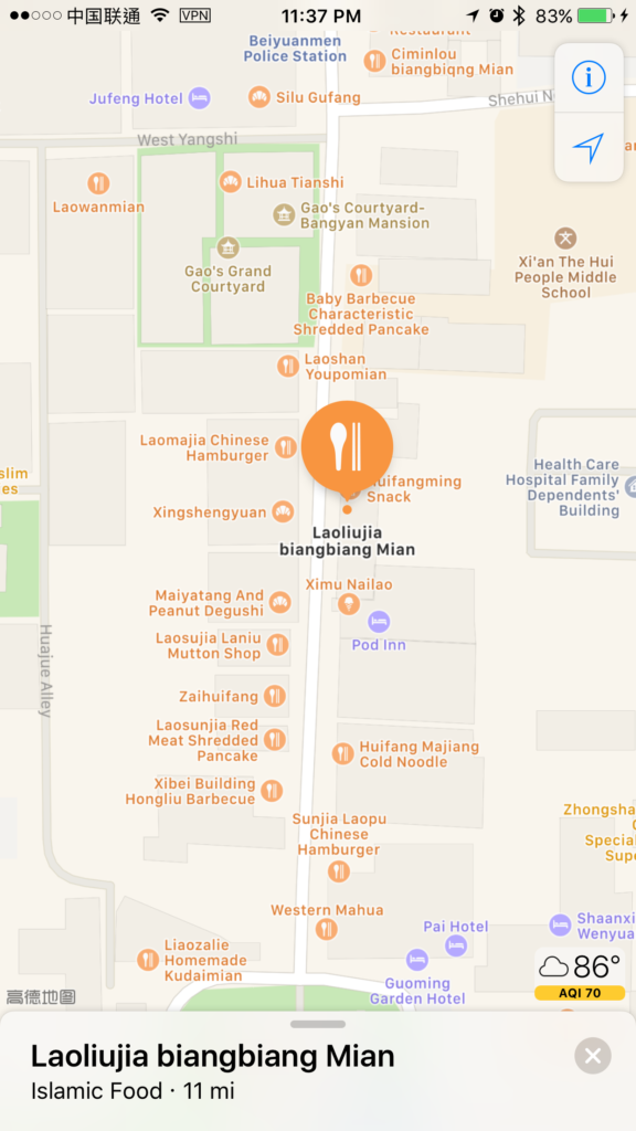 Hearing my complaints, my friend Micah suggested trying Apple Maps. I haven’t opened that app in months. I opened it up and was immediately impressed. First of all, I discovered a well-rated liang pi (cold noodle) restaurant just downstairs from where I was staying. It was not on Google Maps, and it wasn’t even on Swarm or Foursquare (generally my favorite app for local recommendations worldwide). I went for breakfast and it was awesome! I have Apple Maps to thank for that. On Muslim Street, it shows all the local restaurants correctly too: