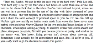 I can relate to Rachel’s struggles to fit her Asian-American identity in with the Asians in Asia. This is a common topic that many Asian-Americans think about and discuss. We often feel like we’re not quite accepted as fully American, but our Asian counterparts also don’t accept us as fully Asian when we go to Asia. Kevin Kwan decided to tell his story through the lens of an Asian-American woman visiting Asia for the first time because, “You think you’re Asian. You think you know what you’re experiencing and then you realize it’s nothing like what you thought.” We’re in this weird cultural limbo where we practice some aspects of each culture, and are clueless about other aspects (like when Rachel tries to drink the water in the bowl used for washing your hands).