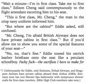 I enjoy traveling, flying first class and staying at luxury hotels (all with points…of course) and I even had the opportunity to fly private jets 5-6 times last year thanks to Jetsmarter. I flew the incredible Singapore Airlines First Class Suites to Singapore back in 2016. The books often describe the frequent traveler lifestyles of its characters in meticulous detail that I have either experienced or can imagine (ok, some are outlandishly unbelievable, like a koi pond in a private 737?!). I highly recommend the series to my travel hacking community as I think you guys would love the descriptions of and references to premium travel just as much as I did. At least, those of you who regularly make redemptions for J/F or have a Jetsmarter membership!