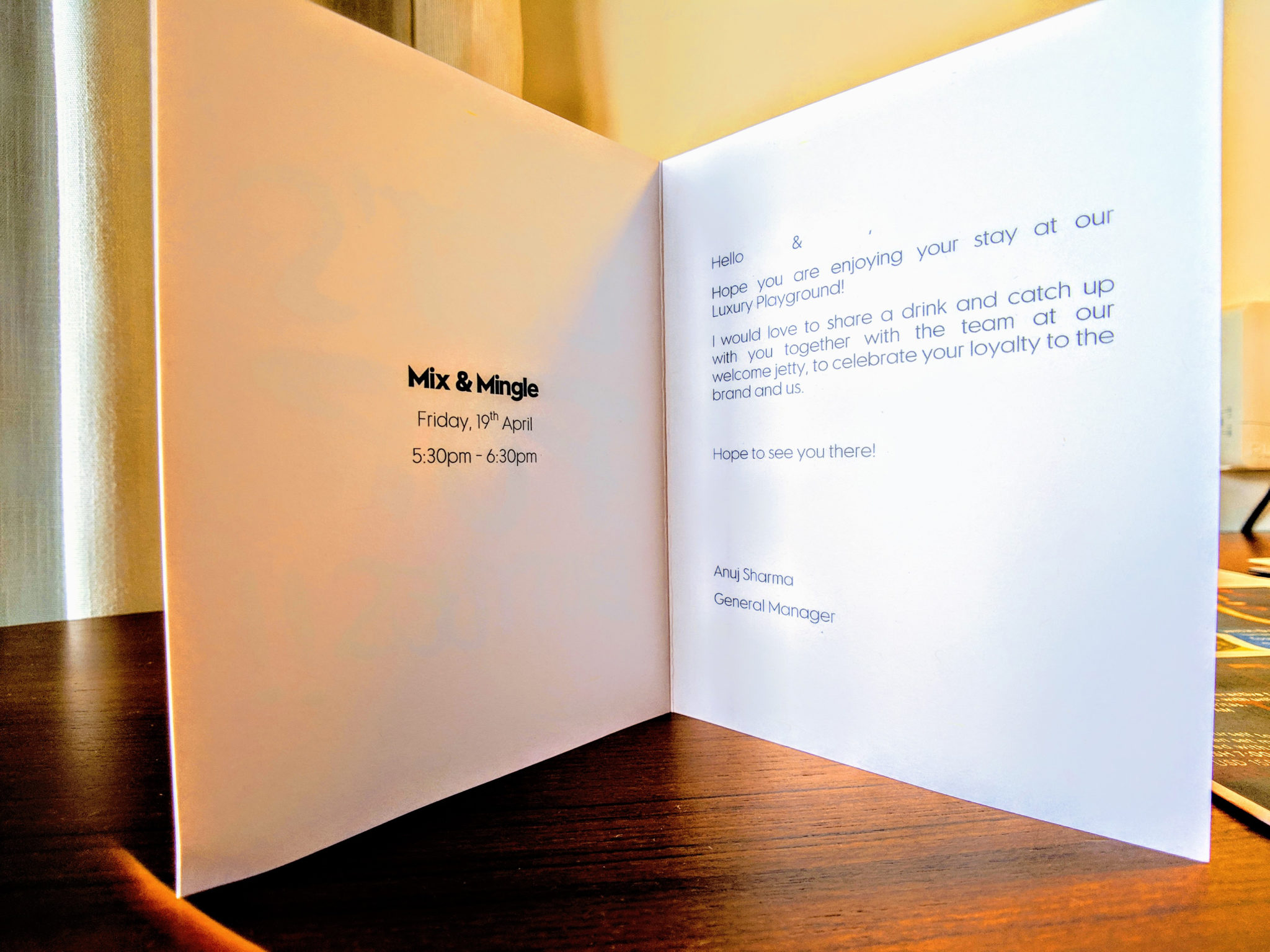 The lounge had drinks, snack packs, cereal, fruit, cookies, chocolate, handmade granola bars, and some pastries. We waited there for a few hours (there was WiFi) and snuck a few snacks/drinks (pro tip: don’t bother taking the drinks, all the non-alcoholic drinks in your room minibar are free and refillable) into our bags as the lounge slowly started filling up with other guests. There were a couple iPads with resort info and April newsletters floating around too. I took a picture of the free activity schedule to keep on my phone, and added their Whatsapp number to my phone (came in handy several times).