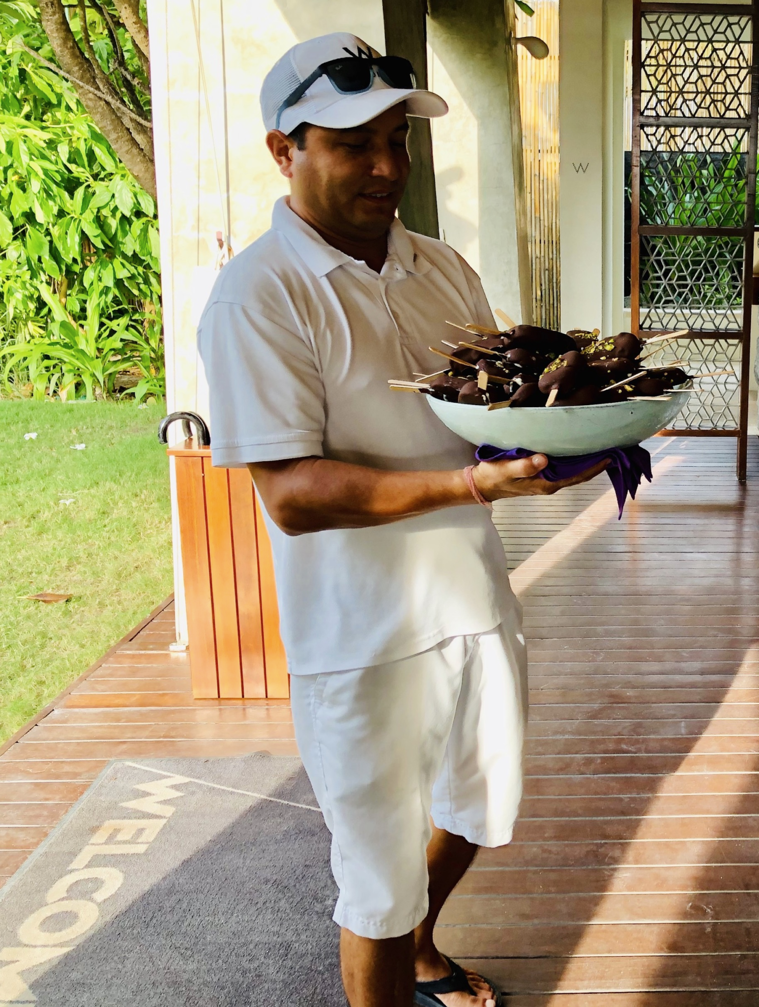Our trip encompassed Easter, and we were surprised when housekeeping knocked on our door and presented us with a platter with a giant chocolate easter egg posing as a scuba diver. He said, “Complimentary” and then explained the special Maldivian palm tree sap drink accompanying the egg. Unfortunately, I was completely chocolate’d out from the welcome amenity and the chocolate cake, so I didn’t touch the egg. I saw housekeeping take it away the next morning as I returned from yoga. It was lying facedown on the platter as if it had melted, fallen over, and died. 😓P.S. that palm sap drink was very good.