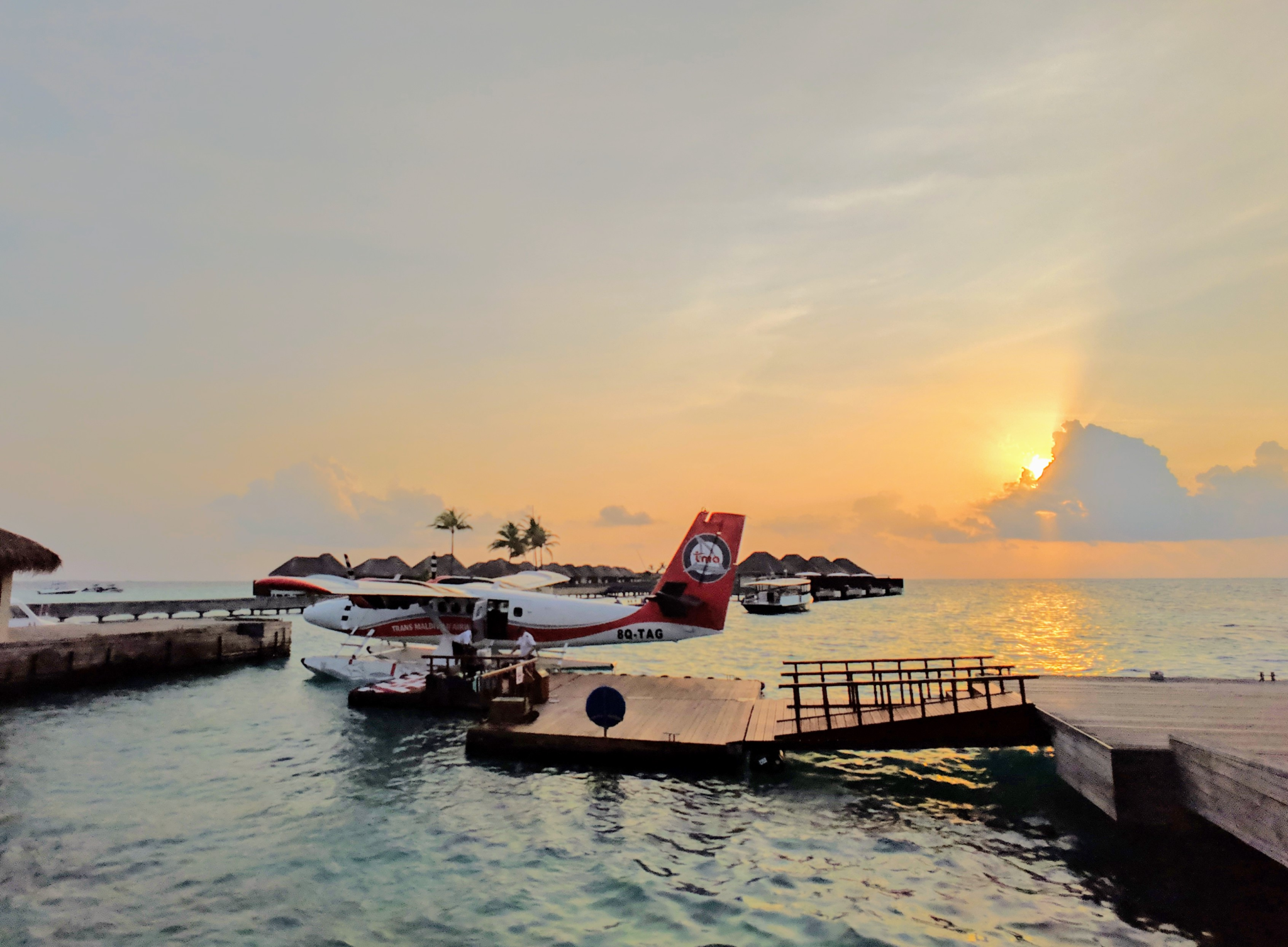 Alas, it was time to leave. We were pretty happy about getting nearly an extra day from our stay from our early arrival to our late departure, but I think we were also ready to go, since we had started running out of new free things to do. Our seaplane was scheduled for 5:30 pm, but we came out of our beach villa at 5 pm and no buggy came to pick us up. We ran into Raj, our fitness instructor, who kindly called the front desk for us, and they sent a buggy. But when we got to the Living Room, we were told that our flight was delayed till 6:30 pm. Since we had already left our room, I took that time to do one last lap around the property for some final sunset pictures (which I already inserted in various places above).