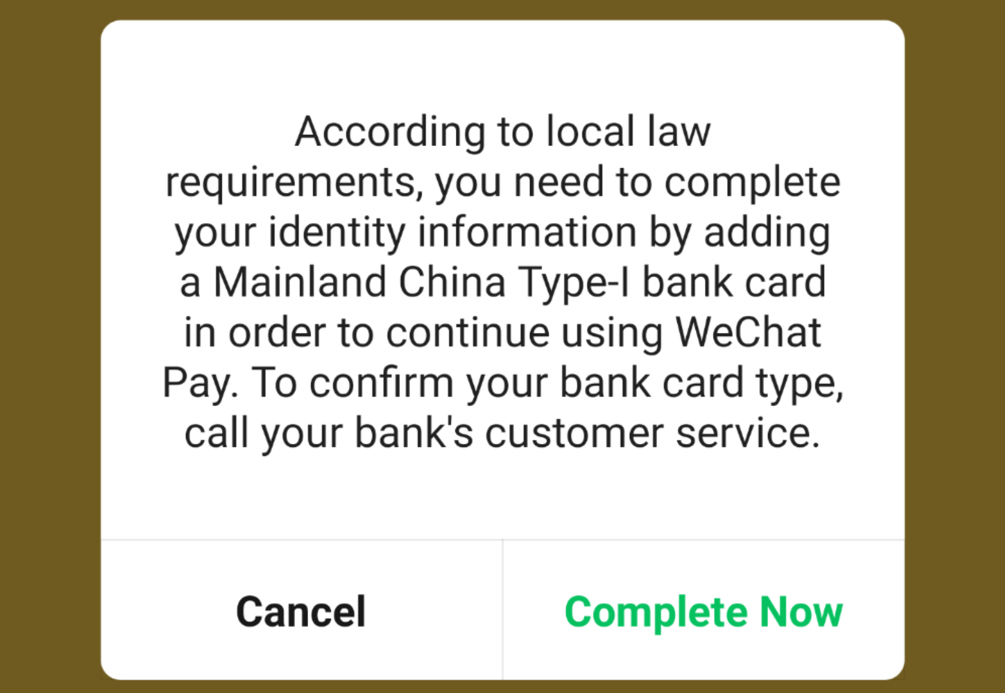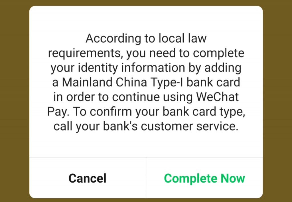 Alright, time for WeChat pay!! When I went to go to add a card, it asked for identify verification.