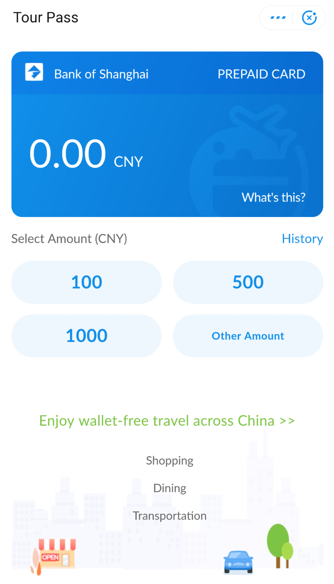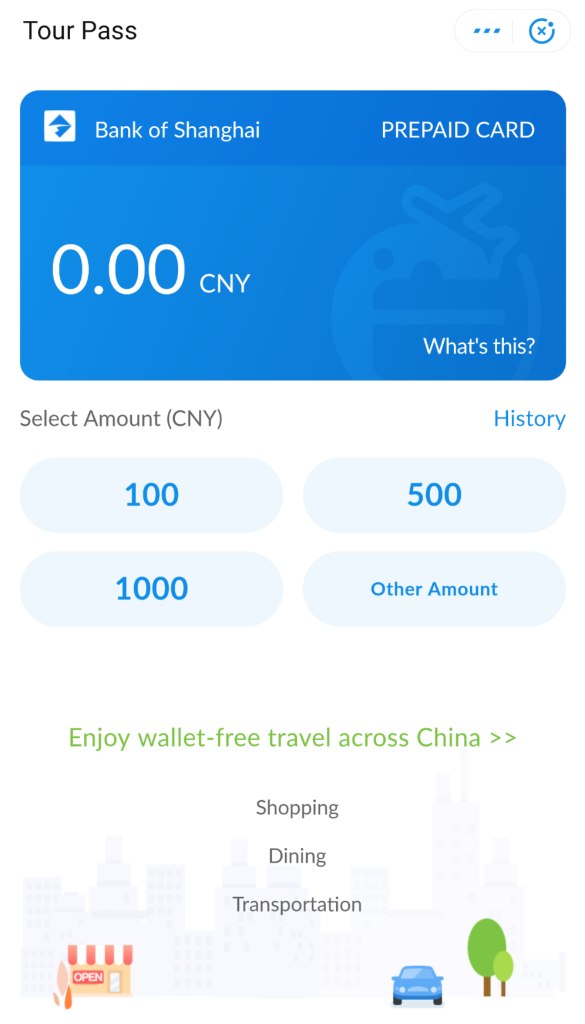 Let’s start with Alipay. With Alipay, you can create and top up a virtual card with a mini program inside the app called Tour Pass. Here are instructions on how to do so.