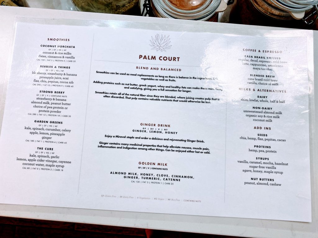 There was a smoothie bar that had amazing smoothies made from great nutritious ingredients. I really enjoyed almost all of them, but my favorites were the blended mint lemonade (not even on the menu, but is amazing!), coconut horchata, berries n’ things, blended golden milk, and blended ginger lemon. I heard the blended iced coffee was great too but I never got around to trying it. The smoothie bar also had little cold snack bites like banana bread, zucchini bread, scones, small sandwiches, yogurt parfaits, and fruit or veggie cups. You could also order a quesadilla or burrito.