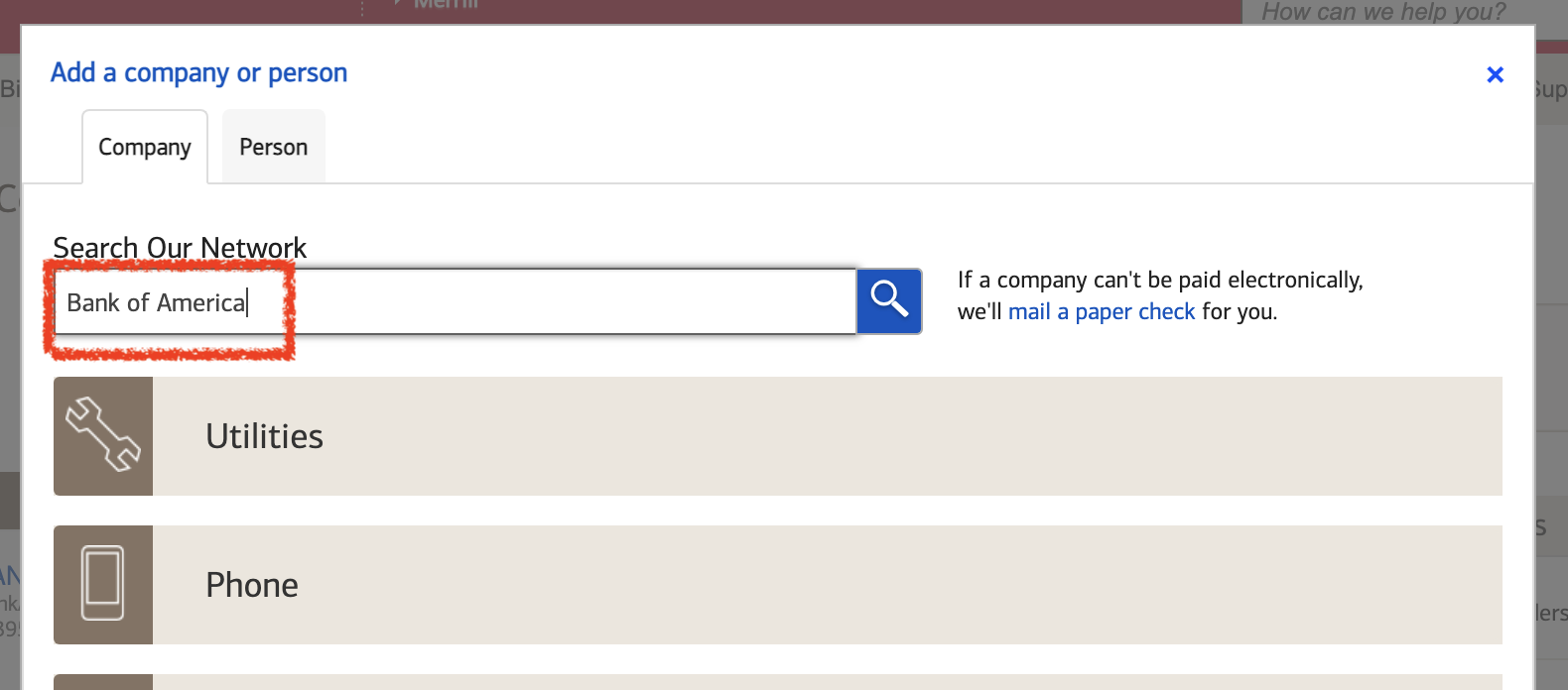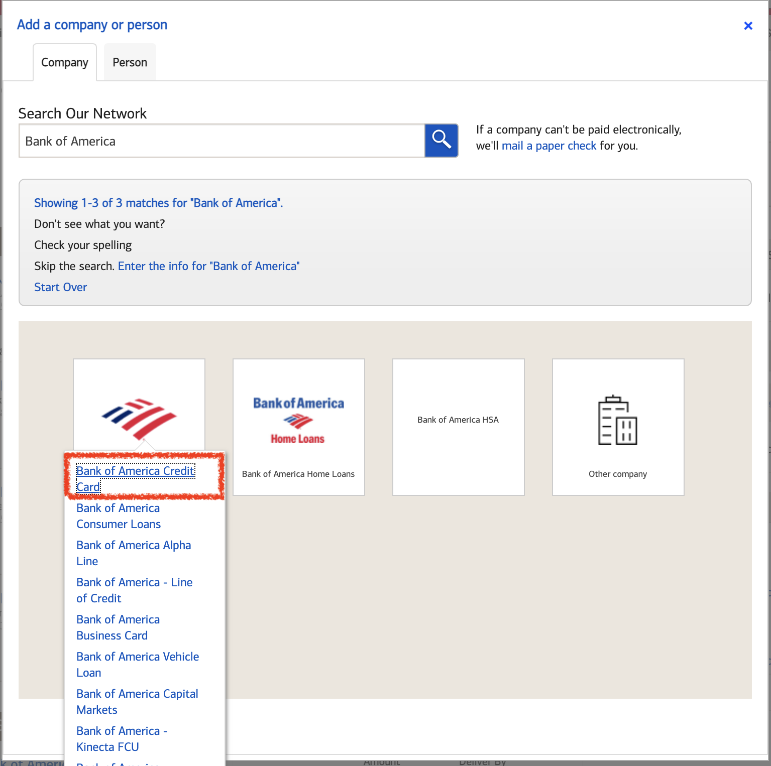 - Type in “Bank of America” in the search bar and select the first icon for Bank of America. Select “Bank of America Credit Card” from the dropdown menu.
