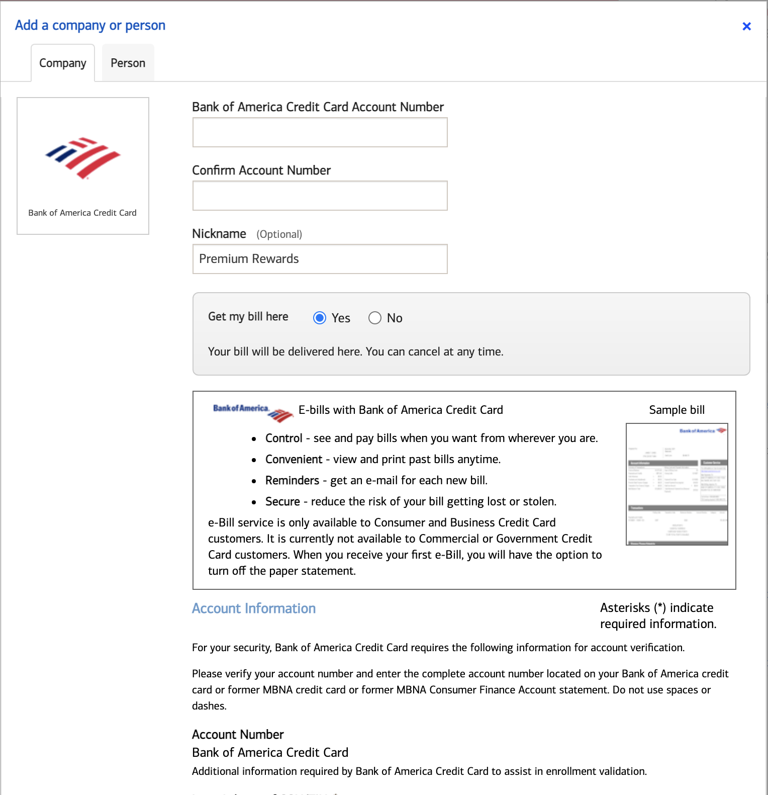 - Type in your new credit card number twice in the fields and give it a nickname (I like to name it by the card product, such as “Premium Rewards”. Leave the “Get my bill here” as Yes and submit.