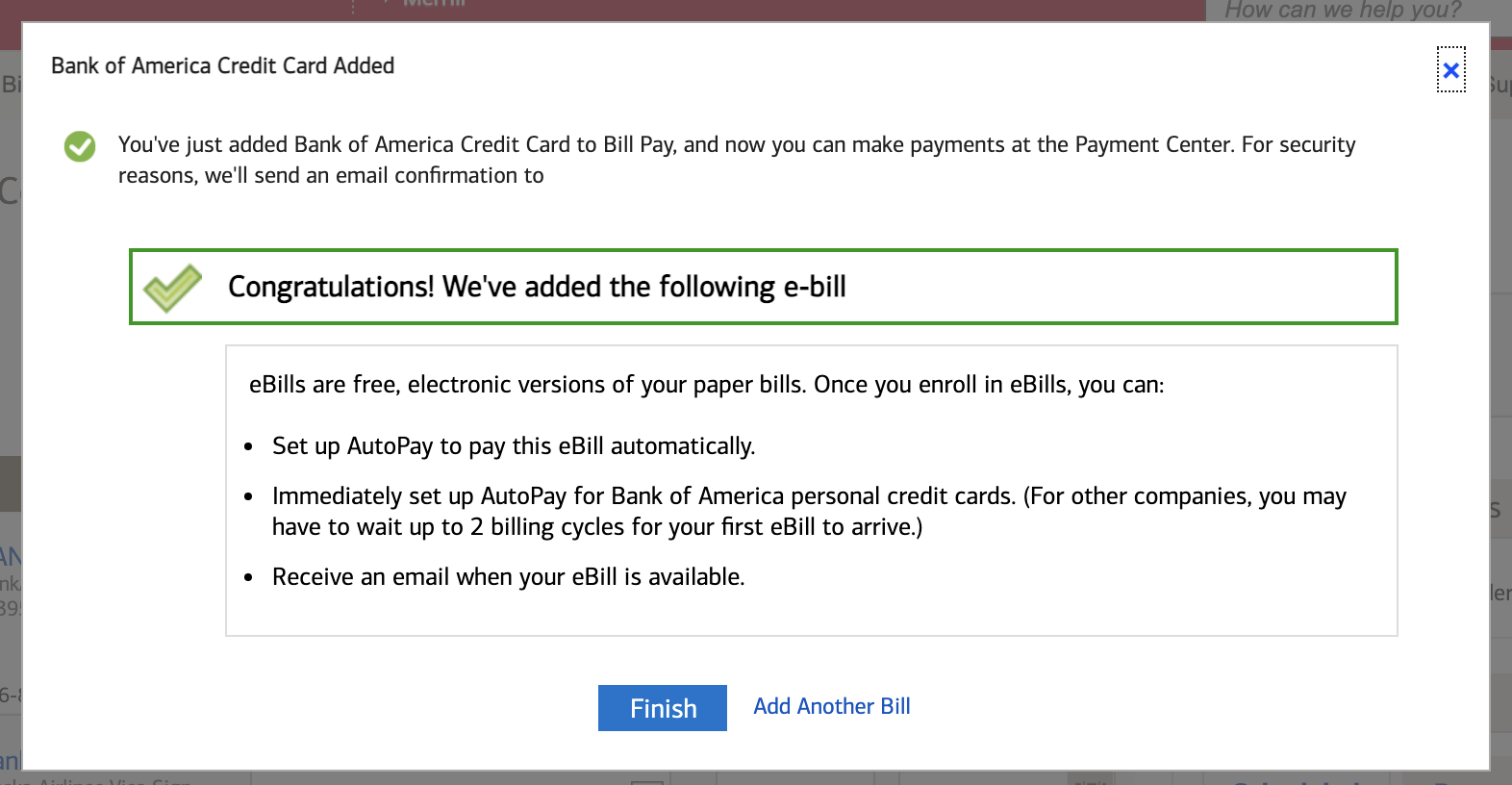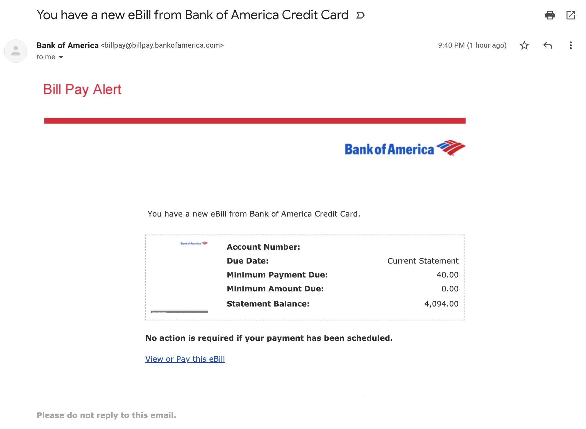 - This step is important and is what confuses some people – you now need to WAIT to get your eBill in your email. I think it took a couple hours for it to arrive. Look for an email titled “You have a new eBill from Bank of America Credit Card” from [email protected].