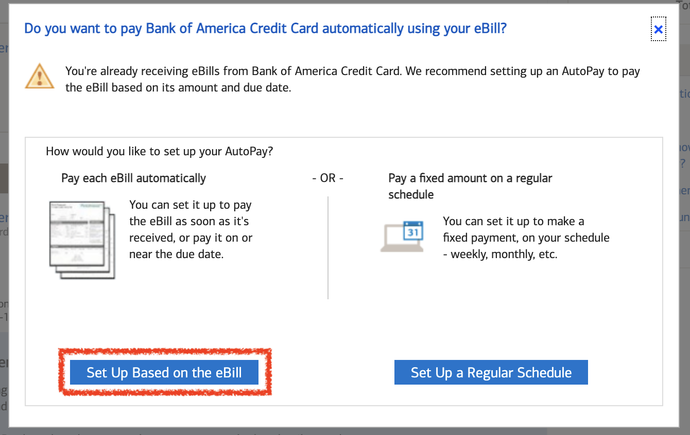 - Find your new card and click on the small “AutoPay” link and then “Set up AutoPay“. Select the leftmost option “Set Up Based on the eBill” and fill out the form with your bank account, delivery date, amount (usually “Statement Balance“), and optional email notifications.
