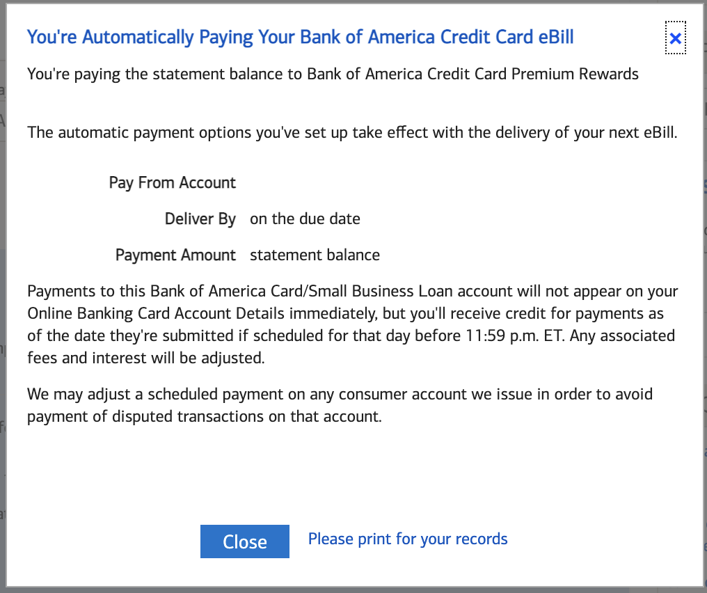Hi all, this seems like such a silly post to write, but I’ve seen a lot of people complain about how different setting up an auto-pay for a credit card at Bank of America is compared to other banks, and how it’s led to missing a payment, getting interest charges, late fees, etc. I’m so used to having all my cards on auto-pay that this happened to me once too. Setting it up is definitely more tedious and requires more clicking around than other banks. So hopefully this post documenting the process helps someone out there.