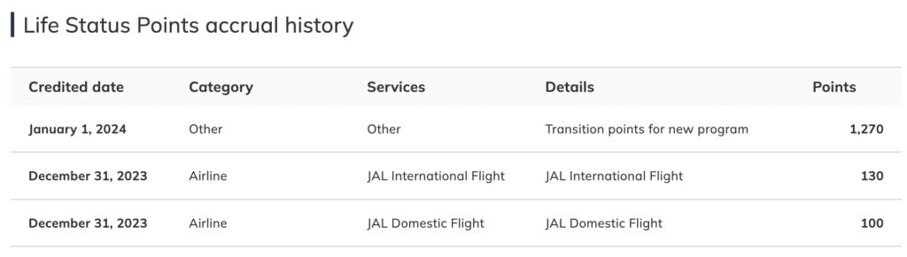 Going into the new program, it was announced your historical JAL activity would be converted to Life Status points. Now it seems like the transition is complete. It appears anyone who was a JAL Global Club member by qualifying in 2023 was topped up to 1500 Life Status points. For example, see my Life Status points. I *believe* this should also apply to non-Japanese residents as well, unless JAL has made an exception for that case. Thus, everyone in this category should be able to keep JAL Global Club and oneworld sapphire indefinitely without any renewal requirement.